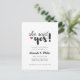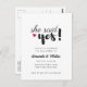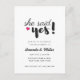 Simples preto e branco "ela disse sim" design festa de noivado convite em um design de tipografia com script de pincel e letra simples de bloco. Personalizar com os nomes do casal, data e hora da parte e local.