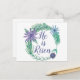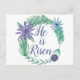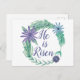 Ele é Risen. Um belo cartão postal de Páscoa religiosa com uma bela coroa floral de roxo e verde. Estas lindas flores aquáticas se regozijam com Jesus Cristo. Bonito presente cristão.
