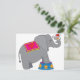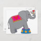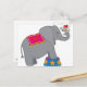 Um elefante de circo em pé sobre uma tina de circo, tem um rato com um coração vermelho em sua tromba.
