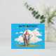 Este é um design gerado por IA. Eu queria um elefante usando um chapéu de aniversário em uma pastagem e foi o que eu consegui. Pensei que um fundo azul claro para o elefante ficava bom. No verso, coloquei o texto Entregue de:, Enviar para:
