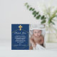 Agradeça a amigos e familiares por comparecerem ao batismo do seu menino enviando a eles este elegante cartão-postal de agradecimento de batismo masculino com cruz dourada em azul-marinho. Este agradecimento de batismo para menino apresenta uma bela cruz dourada com uma moldura dourada contra um fundo simples e elegante azul-marinho. Personalize o texto e a fonte ao seu gosto, incluindo o nome da criança, uma nota pessoal, sua assinatura e seu endereço de retorno no verso do cartão-postal. Adicione uma foto especial do seu bebê para um toque extra especial.