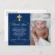 Agradeça amigos e familiares por comparecerem ao batismo do seu menino enviando a eles este elegante cartão-postal de agradecimento de batismo masculino com cruz dourada em azul-marinho. Este agradecimento de batismo para menino apresenta uma bela cruz dourada com uma moldura dourada contra um fundo simples e elegante azul-marinho. Personalize o texto e a fonte ao seu gosto, incluindo o nome da criança, uma nota pessoal, sua assinatura e seu endereço de retorno no verso do cartão-postal. Adicione uma foto especial do seu bebê para um toque extra especial.