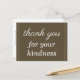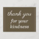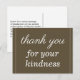Este cartão postal de agradecimento, elegante e limpo, apresenta a mensagem "agradecimento pela sua gentileza" na frente, juntamente com uma mensagem personalizável no verso. Poderia ser usado para agradecer a alguém que fez algo especial.