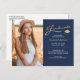 Este anúncio de graduação estiloso de dois lados ou cartão postal de agradecimento apresenta texto moderno fundido com escrita caligráfica elegante em dourado e branco sobre azul marinho. As fotos estão uma na frente e uma no verso. Para ver mais itens como este, visite minha loja aqui em "www.Zazzle.com/LakeViewCardCo". Obrigado