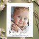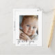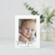 Nosso lindo e elegante cartão de agradecimento para chá de bebê é uma forma atemporal e pessoal de expressar sua gratidão aos entes queridos. Ele combina sofisticação e sentimento ao apresentar sua foto personalizada do bebê emoldurada dentro de uma borda branca simples, porém elegante. Abaixo da foto, um texto moderno e sofisticado escreve graciosamente "Obrigado", adicionando um toque de calor e charme. Abaixo do texto, os detalhes do seu bebê são exibidos em letras elegantes e limpas, proporcionando um acabamento refinado e sofisticado. Pressione o botão para alterar o texto e a imagem, você vai amar!