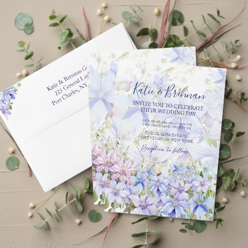 Nossa Elegante Periwinkle Clematis Casando Salve a data Foto é uma maneira maravilhosa de comemorar e compartilhar seu evento alegre. Belo rabisco Clematis floresce derramar sobre fundo de fosco floral. É perfeito para primavera ou verão. Qualquer casamento do tema do jardim seria perfeito