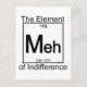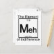 A ciência isolou um novo químico na mesa periódica - o elemento da indiferença, abreviado de MEH. Esta substância comum aparece como um arremesso verbal dos ombros quando você simplesmente não se importa. Química das gírias para as massas - um presente perfeito para... qualquer coisa.