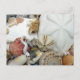 Cartão postal de fotografia de conchas marinhas. Imagens de lindas conchas marinhas, como a bolacha-do-mar, relógio de sol, ouriço-do-mar, conchas de berbigão rosa e laranja, caracóis vermiformes e outros animais marinhos cobrem a frente. O verso está em branco para ser usado em qualquer ocasião ou enviado de uma viagem de férias na praia tropical.