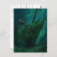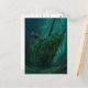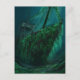 Um naufrágio coberto de algas marinhas está no chão do oceano, banhado num brilho estranho.
