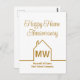 Este cartão-postal moderno do Feliz Aniversário do Lar em ouro é simples e sutil com seu monograma e nome da empresa de imóveis. Ele apresenta um contorno branco minimalista e elegante de uma casa. Cartões-postais modernos de imobiliária para marketing de corretor de imóveis para entrar em contato com clientes antigos.