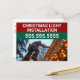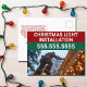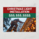 Personalize seus cartões postais de marketing de negócios de instalação leve de Natal colocando o nome ou mensagem de sua empresa em vermelho e verde com o número de telefone acima da fotografia de alguém em uma escada colocando luzes de férias no inverno.