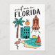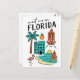 Fuja para o 'Estado do Sol' com este encantador cartão-postal 'Encontre-me na Flórida', apresentando uma deliciosa coleção de ícones da Flórida em um estilo divertido de desenho! Este cartão-postal ilustrado caprichoso captura as famosas praias do estado, a vida selvagem tropical e o espírito inovador. Ele apresenta tudo, desde o lançamento de um clássico ônibus espacial e um flamingo gracioso até uma cena de praia arenosa com um veleiro, uma laranja vibrante e um hotel. As ilustrações divertidas e a letra clara tornam este cartão-postal uma homenagem única e memorável à Flórida, EUA