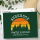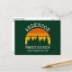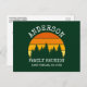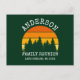 Convite de cartão-postal retrô de verão com pinheiros rústicos e pôr do sol verde floresta para reunião familiar. Ótimo para férias de reunião familiar, desde acampamentos nas montanhas até férias no chalé da família nos bosques à beira do lago.
