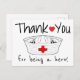 Este cartões de agradecimentos apresenta texto preto junto com um coração vermelho e um chapéu de enfermeiro. É perfeito para agradecer a um profissional de saúde na sua vida por ser um herói, seja um médico, enfermeiro ou qualquer outra pessoa que ajude a manter o hospital ou consultório médico em funcionamento!