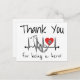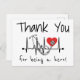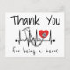 Este cartões de agradecimentos apresenta texto preto junto com uma linha de batimento cardíaco, coração vermelho e estetoscópio. É perfeito para agradecer a um profissional de saúde na sua vida por ser um herói, seja um médico, enfermeiro ou qualquer outra pessoa que ajude a manter o hospital ou consultório médico em funcionamento!