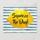 Engraçado citar cartão postal com um limão em 3D, fazendo a citação "Apertar o Dia" em um roteiro de caligrafia em negrito, em um padrão de cor d'água de faixas azuis.