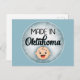 Este cartão postal engraçado apresenta um rostinho de bebê branco fofo que diz "Feito em Oklahoma" em um fundo azul. Perfeito para anúncios de novos bebês ou apenas para diversão.