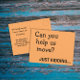 Este é um simples design de texto minimalista com duas fontes e uma sarcástica e engraçada piada na frente que diz: Você pode nos ajudar a nos mover? Só brincando...num fundo laranja vibrante. O verso diz: Mas nós conseguimos! Anote nosso novo endereço e há uma modelo de texto para você adicionar seu novo endereço ou você pode apagar essa peça e gravá-la manualmente. #endereço novo