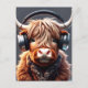 Uma linda vaca escocesa Highland escuta música com fones de ouvido