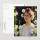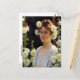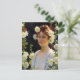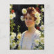 Um cartão-postal de belas artes com a pintura de Charles Courtney Curran (1861-1942), artista impressionista norte-americano, entitulado Entre os Hollyhocks (1904). Um retrato de uma jovem mulher de vestido branco com cabelos de auburn cercados por flores de hollyhock amarelas e vermelhas.