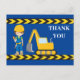 Cartão postal de escavadeira de construção personalizado legal Obrigado para uma criança que ama veículos de construção amarelos em preto e amarelo. Design de veículo divertido para um menino que ama carros e caminhões. Personalize com o nome do seu filho sob a fita de advertência preta e amarela.