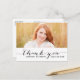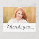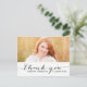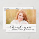 Graduação De Fotos De Script Preto Manuscrito Trendy Obrigado Cartão-Postal. Design por Elke Clarke © Visite nosso compro www.zazzle.com/monogramgallery* para mais cores e estilos. Adicione sua própria foto e texto. Uma simples camada de tipografia negra em chic sobre um fundo branco com as palavras "Obrigado". Substitua a foto de exemplo por sua.