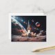 Navio-foguete decola de um planeta extraterrestre com objetos celestes no fundo