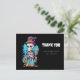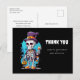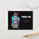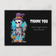 Cartão postal de agradecimento com uma ilustração de um esqueleto engraçado. Vestindo um chapéu-coco, segurando uma bebida. Ele tem um grande sorriso no rosto. Diversão fofa e assustadora para o Halloween.