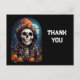 Cartão postal de agradecimento com uma ilustração de um esqueleto vestindo um casaco com capuz e um chapéu de bruxa laranja em cima. Cercado por abóboras fofas e assustadoras. Uma lua brilhante ao fundo com um único morcego voando por perto. Design divertido de outono para o Halloween ou para presentes temáticos de morte, festas ou negócios.