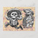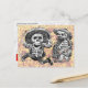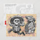Imagem vintage engraçada de um esqueleto masculino vestida com uma armação de carro, carregando um machete, acompanhada por um esqueleto bêbado segurando sua garrafa de licor. Perfeito para o Dia das Bruxas ou o Dia dos Mortos! Ilustrações de J. Posada, 1910 Design © HTM Images