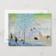 Cena de esqui vintage com pessoas na encosta de esqui acima de uma vila. Arte fina do artista russo Boris Kustodiev.