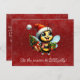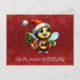 Uma linda abelha feliz segurando presentes nas asas, em um fundo vermelho de floco de neve. ""É a estação para BEE jolly" texto na frente com a mensagem de Natal no verso, que também é um fundo vermelho de floco de neve.