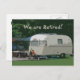 Este cartão-postal diz "Estamos Reformados!" em cima de um velho campista, acampando! A fotografia da antiga campista de colheita foi melhorada e parece uma pintura. Esta pode ser uma maneira humorística de dizer aos seus amigos e família que se aposentou e como eles podem entrar em contato com você agora. A parte de trás é uma modelo fácil de personalizar que diz 'Casa é, onde está a câmera!' e 'Contacte-nos aqui:' para que possa incluir quaisquer informações de contato que tenha, tais como telefone celular e endereço de correio eletrônico. Projetado pela Essência da Natureza em Impressão. Imagem209a