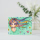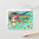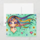 Um cartão de posto com um lápis colorido ilustração tradicional de uma garota com olhos roxos grandes flutuando sobre um fundo verde-teal. Seu lindo cabelo comprido flui para a direita e é feito de fazeres de cordões azuis, rosa, roxas e amarelas que parece um arco-íris. À sua volta há estrelas e corações espalhados.