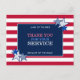 O design ousado e patriótico na frente deste obrigado-você apresenta estrelas azuis e brancas em padrões contrastantes contra um fundo de listras vermelhas no branco, nas cores da bandeira americana. No centro, a área azul de borda branca estão as palavras, "Obrigado pelo seu serviço" na popular tipografia moderna de três cores diferentes. Acima e abaixo destas palavras estão as palavras "Terra dos livres por causa dos corajosos." Este cartão é uma forma excelente de expressar seus obrigados aos veteranos no Dia dos Veteranos ou a qualquer momento.