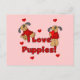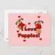 Dois cachorros marrons bonitos vestidos de suéteres vermelhos, corações vermelhos, e texto vermelho que diz "Eu amo púpias!" aparece em t-shirts de cachorros, canecas, sacos de totas, adesivos, chaveiros e muito mais.