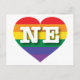 Este cartão tem um coração com um design de orgulho arco-íris e as letras maiúsculas, brancas e em negrito NE, a abreviação oficial para Nebraska, o estado do descascador de milho. O reverso do cartão postal é vazio, aguardando seus sentimentos manuscritos ou texto personalizado. Mostre suas cores verdadeiras, apoie a igualdade do casamento e comemore a orgulho gay.