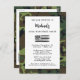 Este convite de aniversário de camuflagem moderno e simples é perfeito para os familiares militares, assim como para os escuteiros e os entusiastas do exército! O convite apresenta um quadro de camuflagem verde e uma mistura de roteiro moderno e tipografia em apuros rústicos a preto sobre fundo branco. O texto é dividido por uma bandeira dos EUA a preto e branco. No verso, há um texto modelo adicional. Personalize este cartão postal de convite de aniversário e torne-o exclusivo para você clicando no botão "Personalizar" e mudando as informações e uma foto para sua!