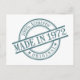 Com um logotipo redondo verde em estilo de carimbo de borracha com “Cem Por Cento Autêntico” escrito no topo e “Original” na parte inferior, ladeado por estrelas de cada lado, e “Feito em 1972” escrito na frente entre duas linhas em ângulo, este é o cartão de saudação perfeito para enviar a qualquer pessoa nascida no ano de 1972.