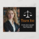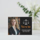 O elegante advogado negro e laranja obrigado seus cartões postais com as escalas de justiça ao lado de sua graduação ou foto do escritório. Personalize estes cartões postais da faculdade de Direito de obrigados com guião branco chic ao lado da fotografia do advogado.
