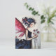 Uma fada com um vestido preto segura um buquê de flores uma pintura desordenada usando paleta de cores minimalista.
