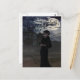 Uma fada de cabelos escuros vestida com um longo roupão preto fica à luz de uma lua de cheio perto de um portão coberto de ivy, enquanto os morcegos sobrevoam.