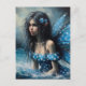Uma adorável fada irritada num vestido de bolinhas azul e branca no oceano. Ela está aborrecida porque uma lufada de vento a jogou na água em vez de pousar na praia arenosa.