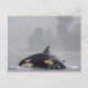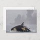 Uma orca e seu filhote nadando na legal manhã sombria.
