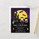 Este convite de aniversário divertido e assustador apresenta vampiros fofos ao lado de uma casa assombrada torta. Ao fundo está uma lua cheia com morcegos e um céu noturno roxo com estrelas. O texto combina fontes decorativas e serifadas para um visual elegante e moderno. Isto é perfeito para o Halloween.