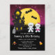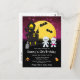 Este convite de aniversário divertido e assustador apresenta múmias fofas ao lado de uma casa assombrada torta. Ao fundo, há uma lua cheia com morcegos e um céu noturno rosa com estrelas. O texto combina fontes decorativas e serifadas para um visual elegante e moderno. Isso é perfeito para o Halloween.