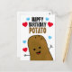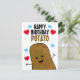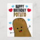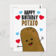 Batata marrom feliz e divertida cercada por corações de amor vermelhos e azuis com Feliz Aniversário Batata em letras pretas e marrons acima de sua cabeça.