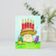 Este design de cartão de aniversário foi pintado usando aquarelas e é desenhado no estilo de desenho animado. No meio você pode ver um cogumelo fofo. Seu boné se assemelha a um bolo de aniversário, com massa amarela e camadas de chocolate marrom. O topo está coberto com glacé rosa e bagas vermelhas. Há cinco velas de aniversário queimando no topo do boné. O cogumelo está crescendo na grama que é uma cor verde vívida. O fundo é azul-céu. Há três presentes na grama ao redor do cogumelo. À esquerda há um presente amarelo com uma fita laranja no primeiro plano; no fundo há um presente verde com uma fita verde escura. Um caracol está sentado sobre ele. Do lado direito está outro, roxo presente com uma fita roxa escura. Um pequeno caracol está alegremente se movendo no boné do cogumelo.