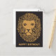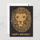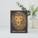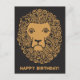 Um rosto de leão vintage legal com juba encaracolada de um desenho do início do século 20 é mostrado aqui em dourado sobre preto. A mensagem de Feliz Aniversário na parte inferior pode ser editada.