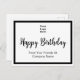 Você pode adicionar seu logotipo na frente deste cartão postal. O logotipo estará acima de um texto que diz Feliz Aniversário. Duas linhas de texto de exibição estão abaixo do texto para sua mensagem personalizada. O cartão postal tem uma borda preta.